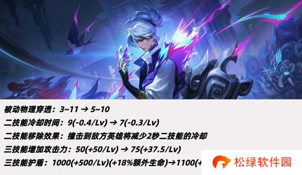 被动穿透前期增加2点、满级减少1点,二技能前期缩短2秒、满级缩短1.5秒。