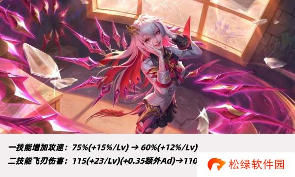 一技能攻速前期下调15%、满级下调30%,二技能下调5-10点伤害、上调0.03额外AD加成。