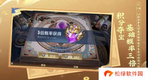 活动时间1月28日-2月4日,积分夺宝单抽45荣耀积分,五连抽200荣耀积分,荣耀水晶爆率提升至三倍。