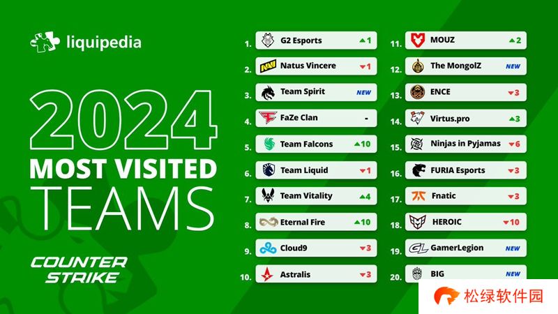 日前液体百科分享了2024年CS百科页面中访问量Top20战队。排名第一的是