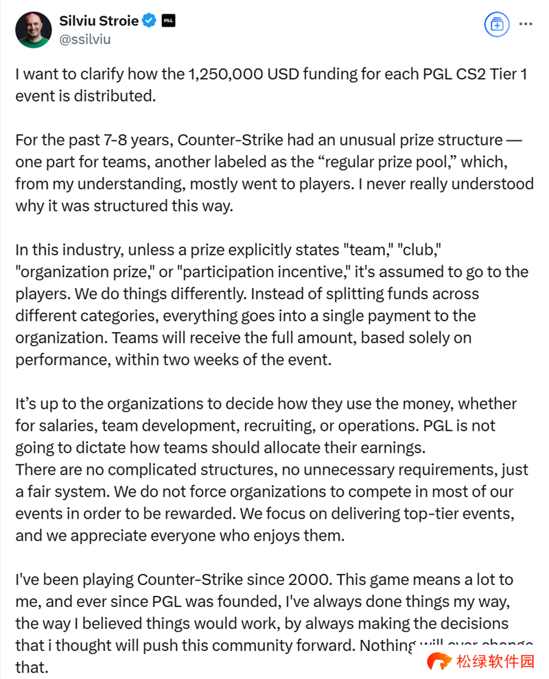 我从2000年就开始玩CS了。这款游戏对我意义重大,自PGL成立以来,我一直按自己的方式行事,按我认为可行的方式,做出那些我觉得能推动这个游戏社区向前发展的决策。这一点永远不会改变。 ”