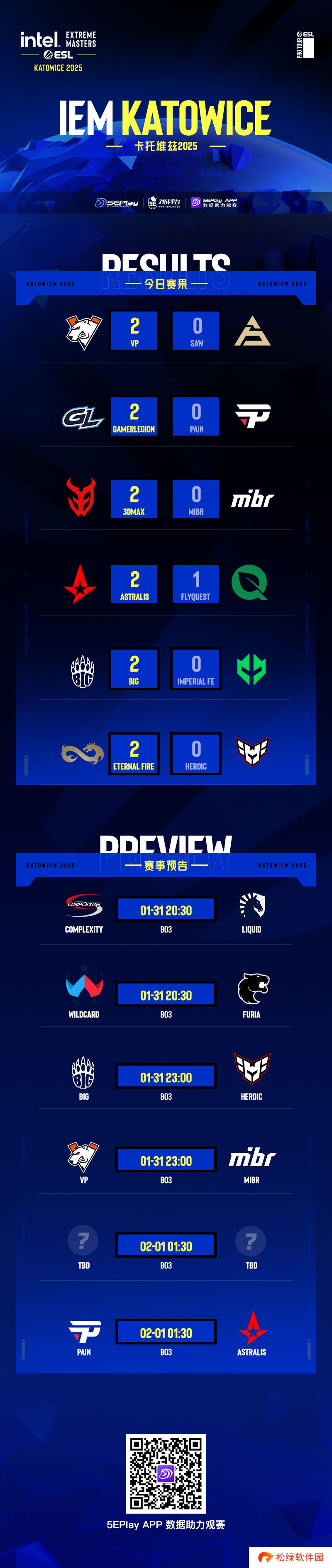 Imperial fe遭淘汰。在明日比赛中将迎来北美战队COL和Liquid的生死之战,Wildcard也将与FURIA争夺晋级名额……以下为今日赛果、明日预告一览: