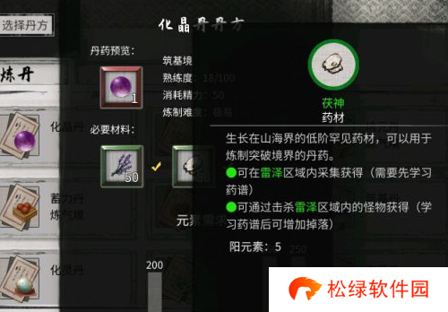 1、化晶丹:霓裳草×50、茯神×50、大蕨根茎×50。