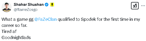 flameZ:真是一场精彩的比赛,gg FaZe。这是我职业生涯中第一次进入到Spodek竞技场。累坏了,晚安,兄弟们。