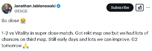 EliGE:只差一点点。在与Vitality的比赛中以1-2的比分落败。第一张地图被打爆了,但在第三张地图上我们有很多机会。现在还处于早期阶段,还有很多可以改进的地方。明天对阵G2。