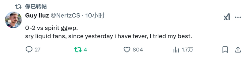 NertZ谈不敌Spirit:昨天起一直在发烧