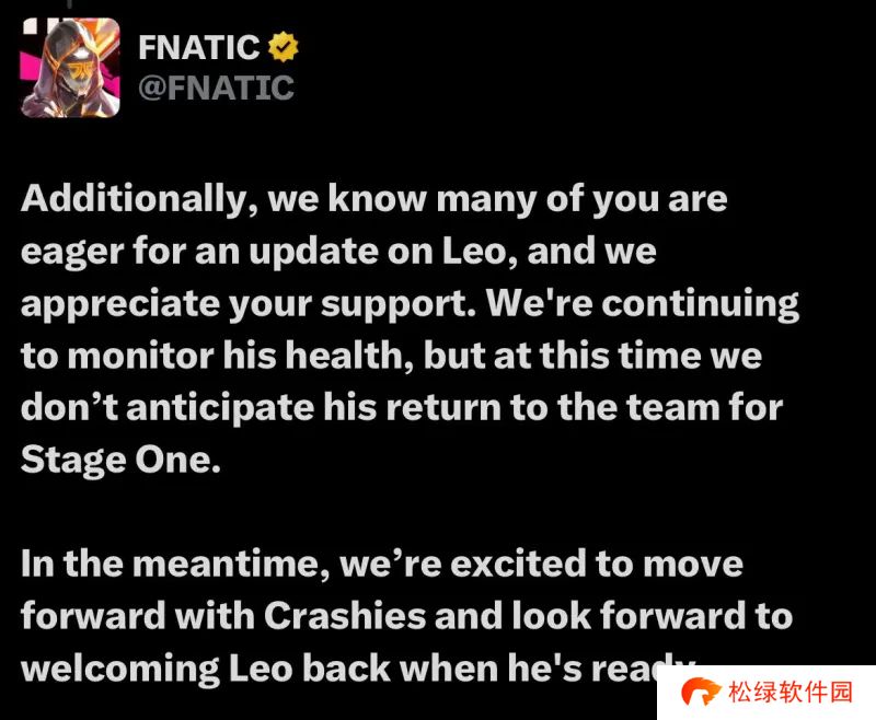 Fnatic官方发布公告,确认队员Leo因健康原因将暂时无法回归战队参加后面第一赛段的比赛。Fnatic官方表示会持续关注Leo的健康状况,并在他完全康复后欢迎他重返赛场。