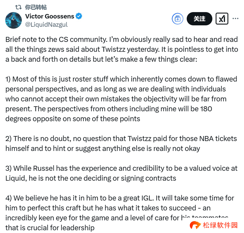 Liquid创始人兼联合CEO Victor Goossens在社交平台上回应了前教练zews在播客中对Twistzz的指责。