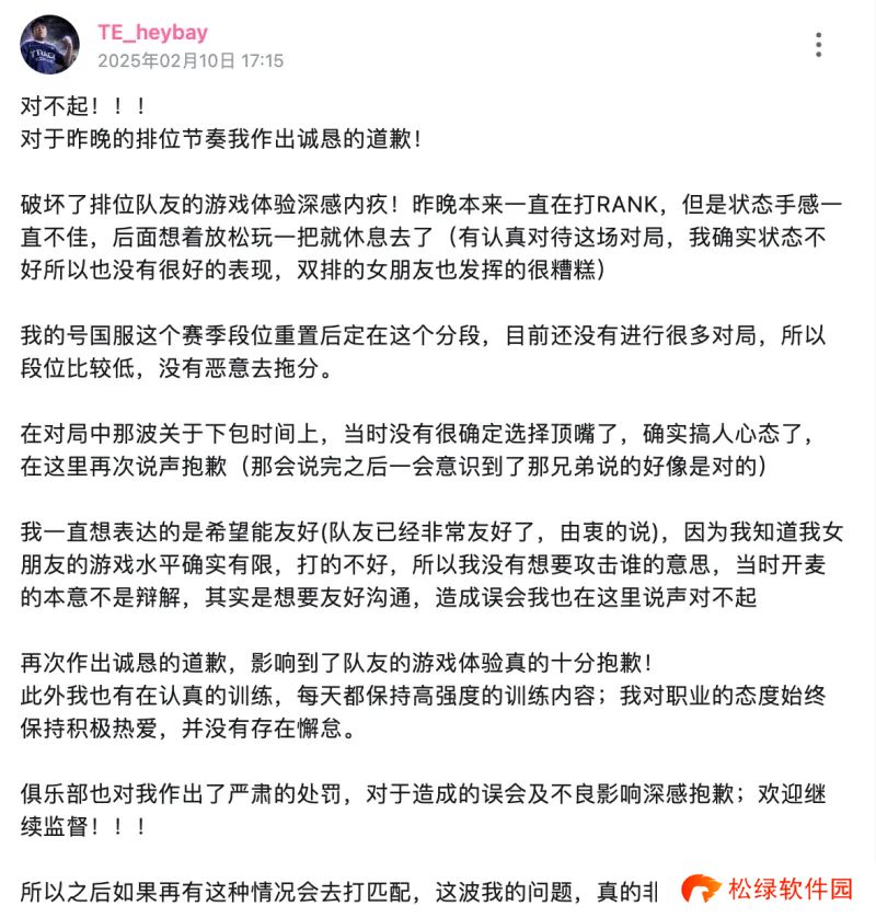 对于此前排位引发的节奏,TE俱乐部选手heybay发文道歉,原文如下: