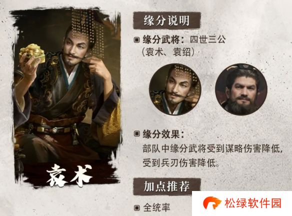 同时,袁术、袁绍同为东汉末年袁氏家族的后裔,两人的缘分效果“四世三公”还会让两人获得一定的减伤效果。