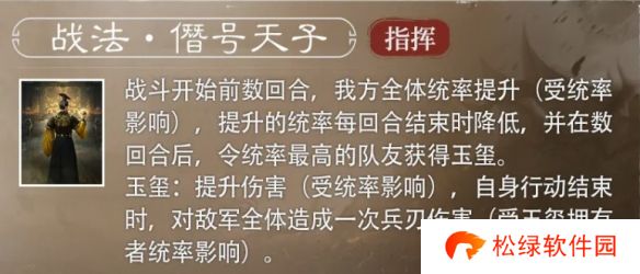 战斗开始前数回合,我方全体统率提升(受统率影响),提升的统率每回合结束时降低,并在数回合后,令统率最高的队友获得玉玺