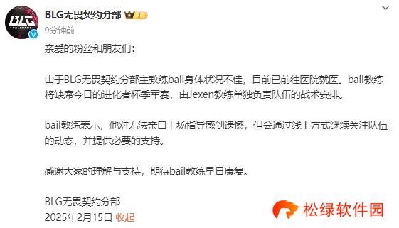 今日17点举行发2025无畏契约进化者杯系列赛第一幕的季军赛,赛前BLG发布公告称主教练bail身体欠佳缺席今日比赛: