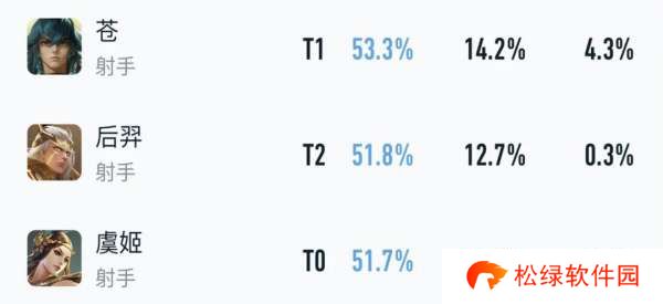 巅峰赛禁选率>5%胜率前三射手英雄:
