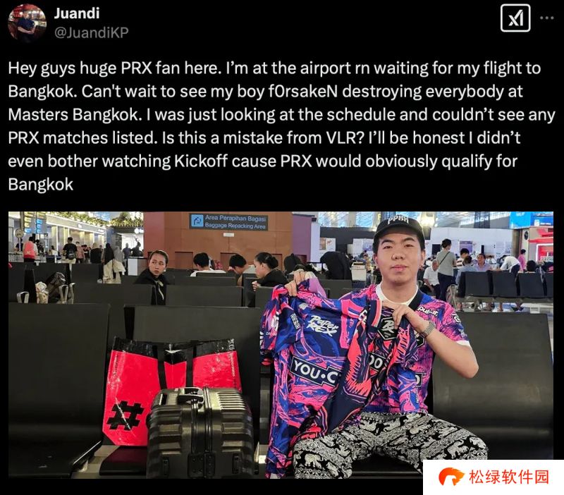 嘿,大家好,我是PRX的超级粉丝。我现在正在机场,等我的飞往曼谷的航班。已经迫不及待想看我兄弟f0rsakeN在曼谷大师赛上碾压所有人了。我刚看了下赛程表,发现上面没有列出PRX的比赛。这是VLR的失误吗?
