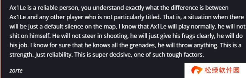 “Ax1Le是个可靠的人,你能确切地明白他和其他心态一般的选手之间的区别。比如说,在地图上出现那种僵持的局面时,我知道Ax1Le仍会正常发挥,他不会搞砸。他开枪时不会慌乱,会稳稳地拿下击杀,做好自己的工作。我敢肯定,他对所有投掷物都了如指掌,该扔什么就扔什么。这就是他的优势,就是可靠。这非常关键,也是他的突出特质之一。 ”