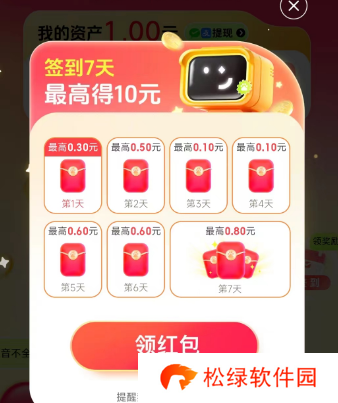 2、每日签到:只需完成每日签到就能获得对应的数额的红包奖励,累计签到7天最高可获得10元。