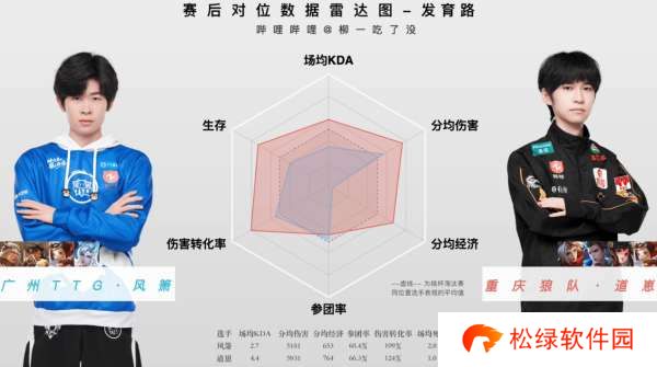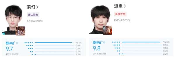 道崽这边,作为LoveCD带到狼队的第一个“硬货”,在本周的发挥也同样神勇。对阵广州TTG的比赛不必多说,大场比分3-1,但在发育路的对位上说道崽4-0风箫毫不为过。