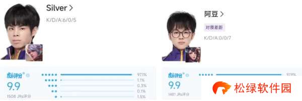 去年年总、挑杯都是KDA发育路倒数的silver,在与阿豆搭档后,首秀对阵北京JDG一手百里守约直接交出6-0-5、38.4%的完美表现。