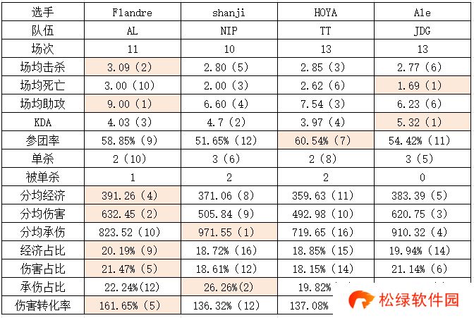 shanji以及Ale各自有两项数据领先于其他人,其中Ale的场均死亡最少,KDA也位列上单位第一;shanji则是在承伤上有较为不错的表现,分均承伤位列上单位第一,承伤占比位列第二;