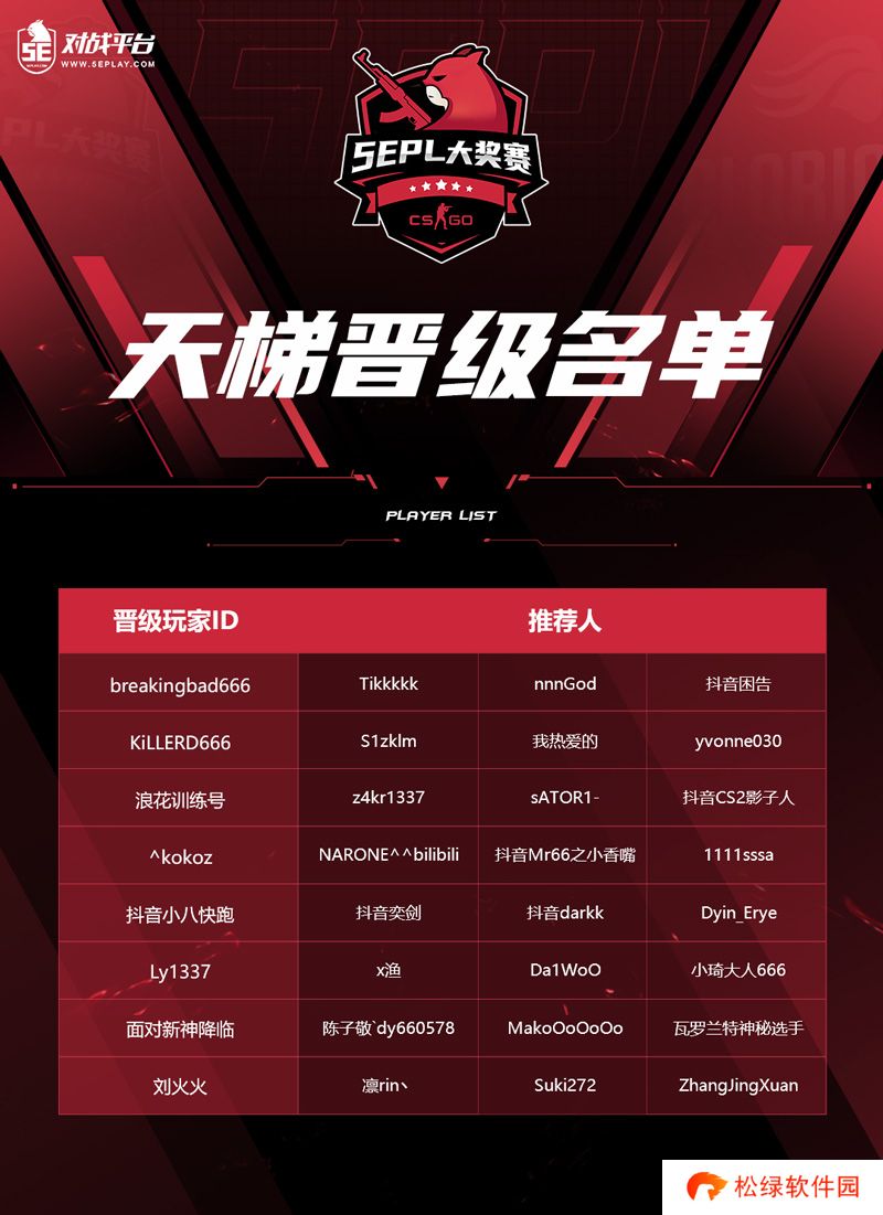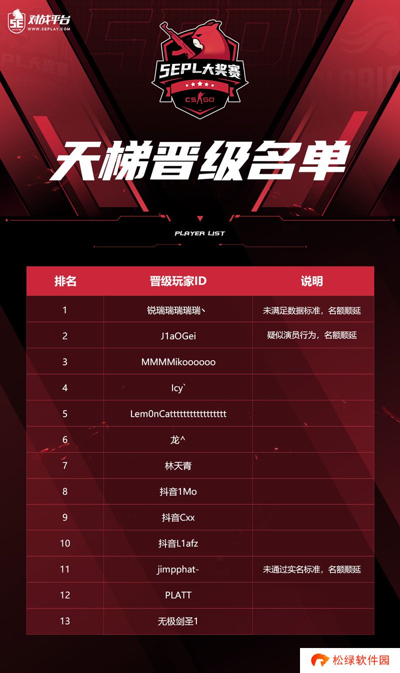 该渠道晋级名单来自于2024 S5赛季天梯TOP10。晋级选手需接受5EPL官方审核,未通过审核或已有5EPL资格的选手,其5EPL资格将顺延发放。
