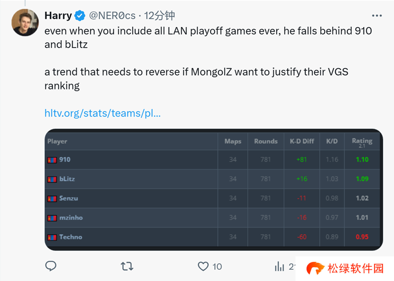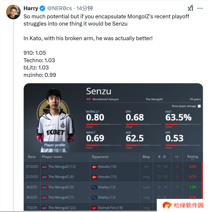 “即便把所有的线下淘汰赛比赛都算进去,他(Senzu)的表现还是落后于910和bLitz。