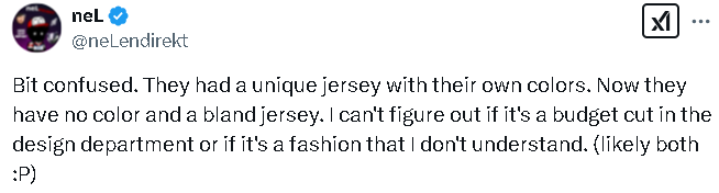 CS记者neL:有点困惑。他们曾经有一款独特的队服,配有自己的色彩。现在却没有颜色,设计也显得单调。我不知道这是不是设计部门的预算削减,还是我无法理解的时尚潮流。(可能两者都有 :P)