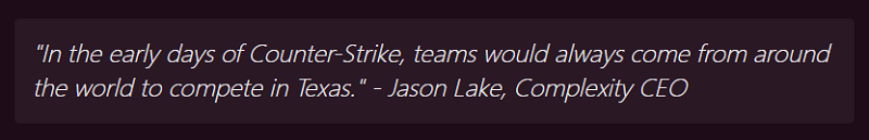 Complexity战队CEO Jason Lake:“在CS早期,来自世界各地的队伍都会来到德克萨斯州参加比赛。”