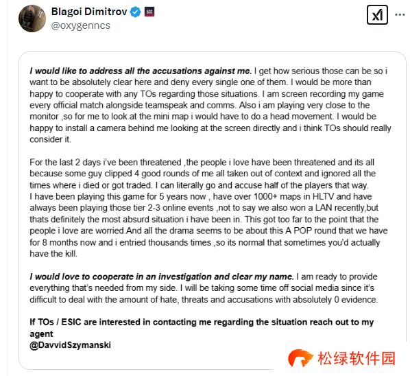 在过去的两天里,我受到了威胁,我的家人也受到了威胁,这一切都是因为有人剪辑了我四轮表现良好的片段,这些片段都被断章取义,怎么不把我白给的时候也剪下来呢?我完全可以以这种方式指控一半的玩家。我已经玩这款游戏五年了,在HLTV上有超过1000张地图的记录,并且一直参加那些二级和三级的线上赛事,更不用说我们最近还赢得了一个线下赛,但这绝对是我遇到过的最荒谬的情况。事情已经发展到我的家人都在担心的地步。