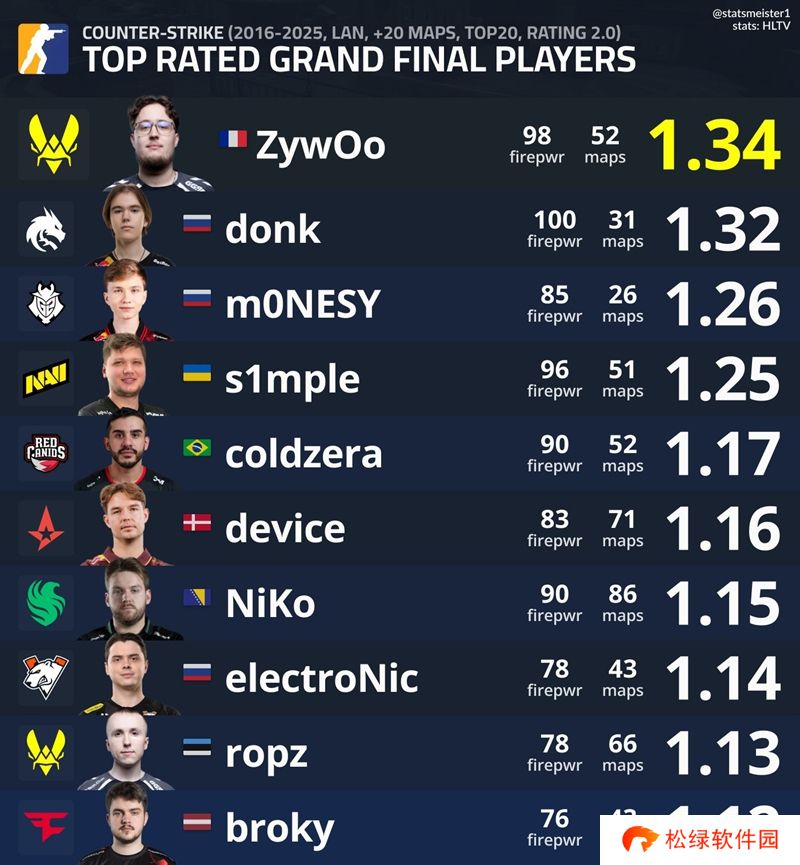 statsmeister整理数据:ZywOo、donk和m0NESY是决赛型选手