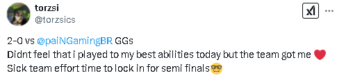 torzsi:以2-0战胜paiN,感谢大家的精彩表现。今天我感觉没有发挥出最佳水平,但团队的努力让我感到骄傲。现在是时候全力以赴准备半决赛了。