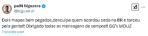 很高兴队员们今天顶住了压力。GG,biguzera。你在Mirage上带领队伍打出的表现令我印象深刻。