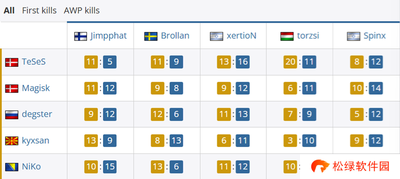 这项数据上NiKo除了面对Jimpphat处于下风,和剩余MOUZ选手都打得有来有往,甚至支配Brollan和Spinx两名枪男。而MOUZ选手xertioN面对Falcons所有队员的对位数据都占据上风。Spinx则只在NiKo身上吃瘪。