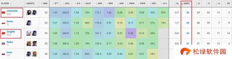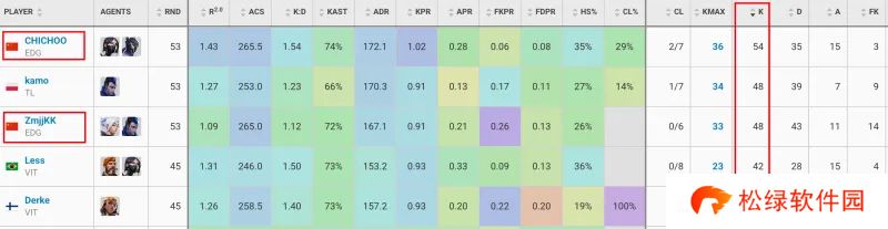 最高击杀:CHICHOO、ZmjjKK分别位列第一、第三