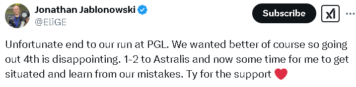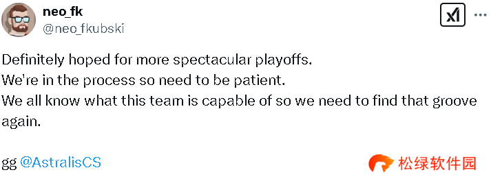 EliGE:在PGL的征程以遗憾告终。我们当然希望能有更好的表现,因此以第四名的成绩结束令人失望。对阵Astralis的比赛以1-2落败,现在我需要一些时间来调整自己并从错误中吸取教训。感谢大家的支持。