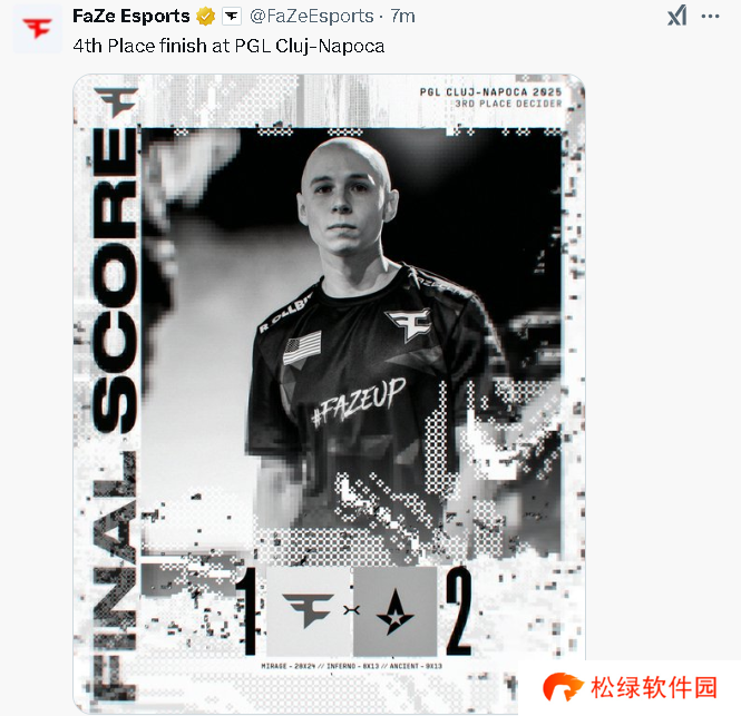FaZe官推:在PGL 克卢日-纳波卡赛事中获得第四名的成绩。