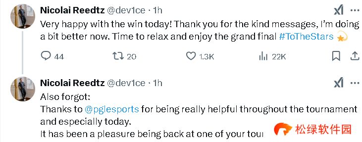 device:今天的胜利让我非常高兴!感谢大家的关心,我现在感觉好多了。是时候放松一下了。另外,特别感谢PGL在整个比赛期间的支持,尤其是今天。能够再次参加你们的比赛真是我的荣幸。