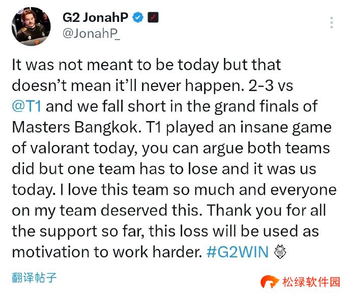 JonahP:今天未能如愿,但这并不意味着梦想永远不会实现。我们以2比3输给了T1,在曼谷大师赛的总决赛中遗憾落败。T1今天在Valorant的比赛中发挥得非常出色,你可以说两队都表现得很棒,但总有一方要输,而今天输的是我们。