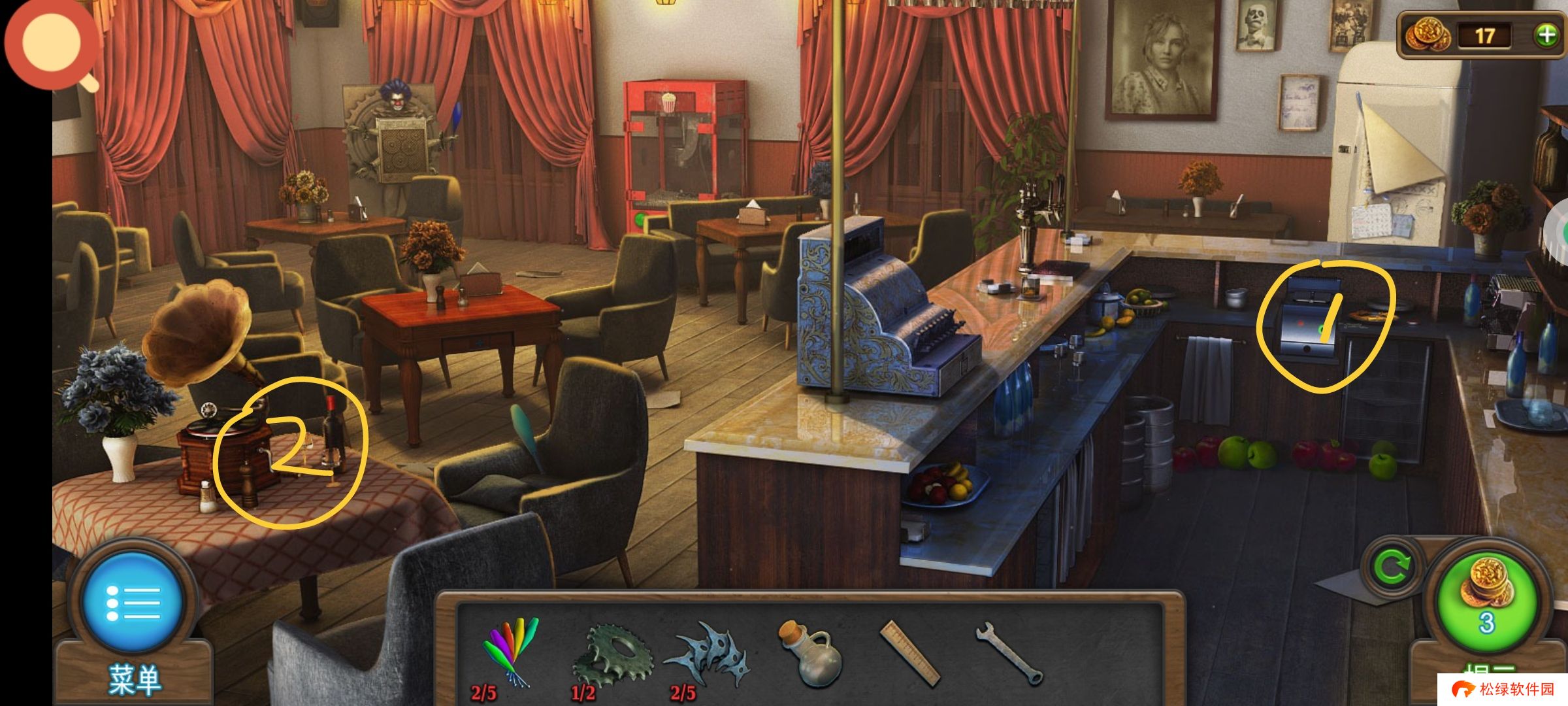 进入厨房,❶红圈处使用钥匙,完成小游戏后获得代币。❷接着使用尺子获得**2。