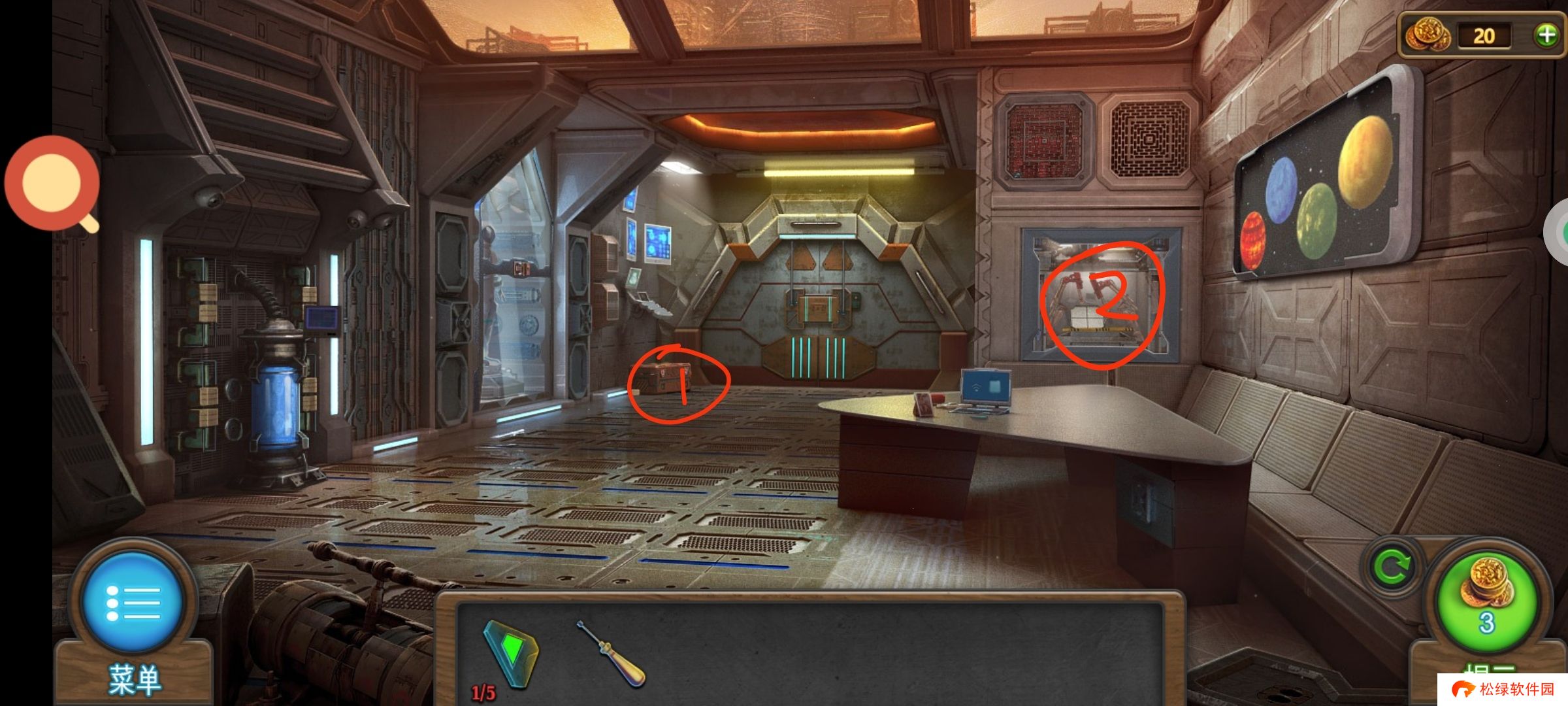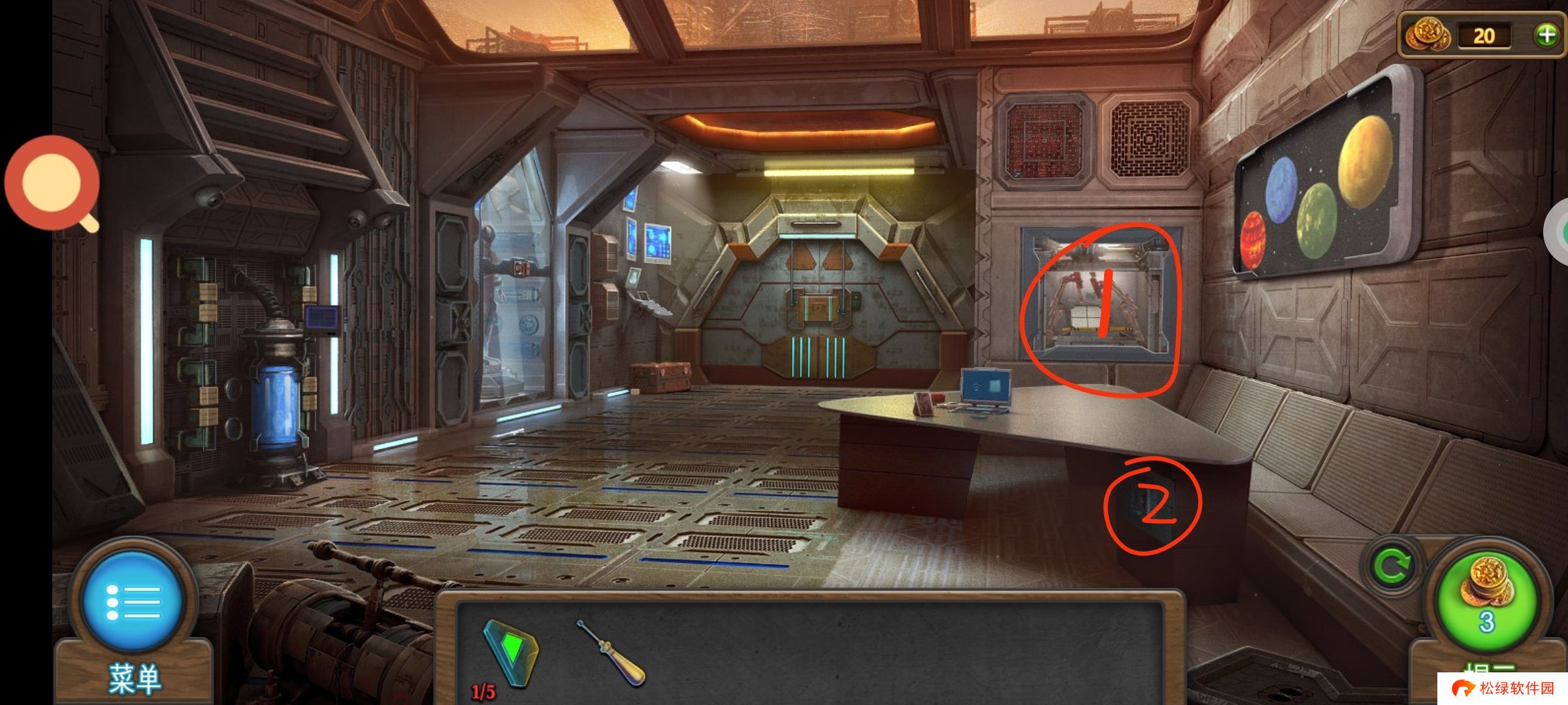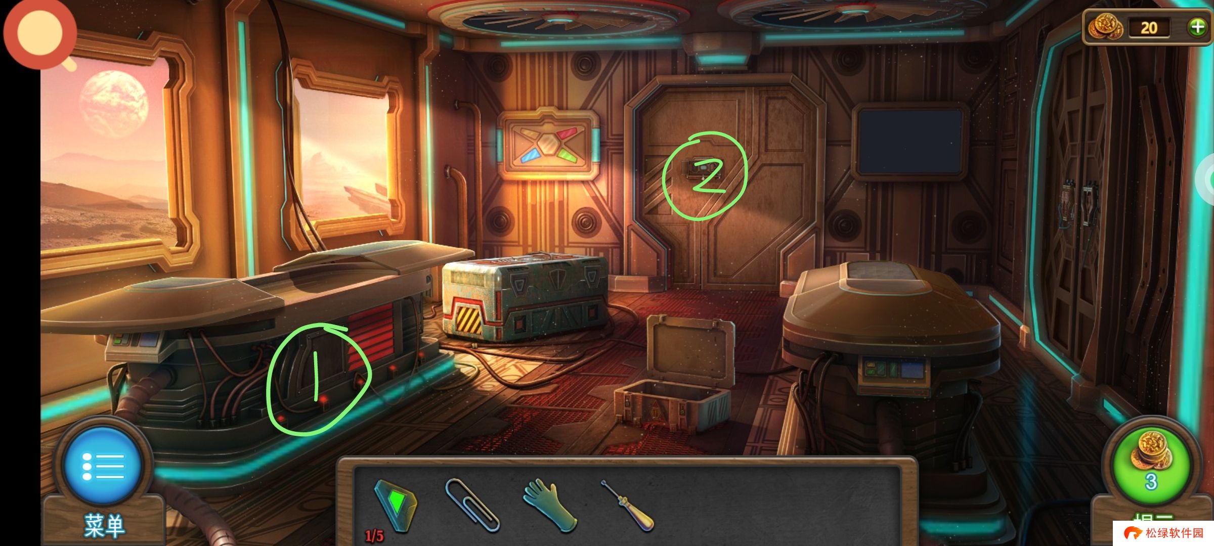 红圈处使用绿零件,完成小游戏。穿上太空服进入场景3。