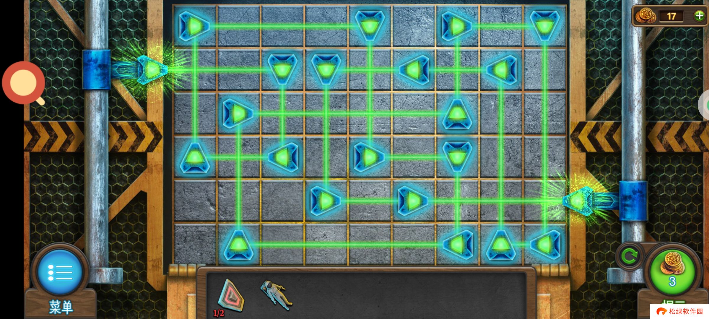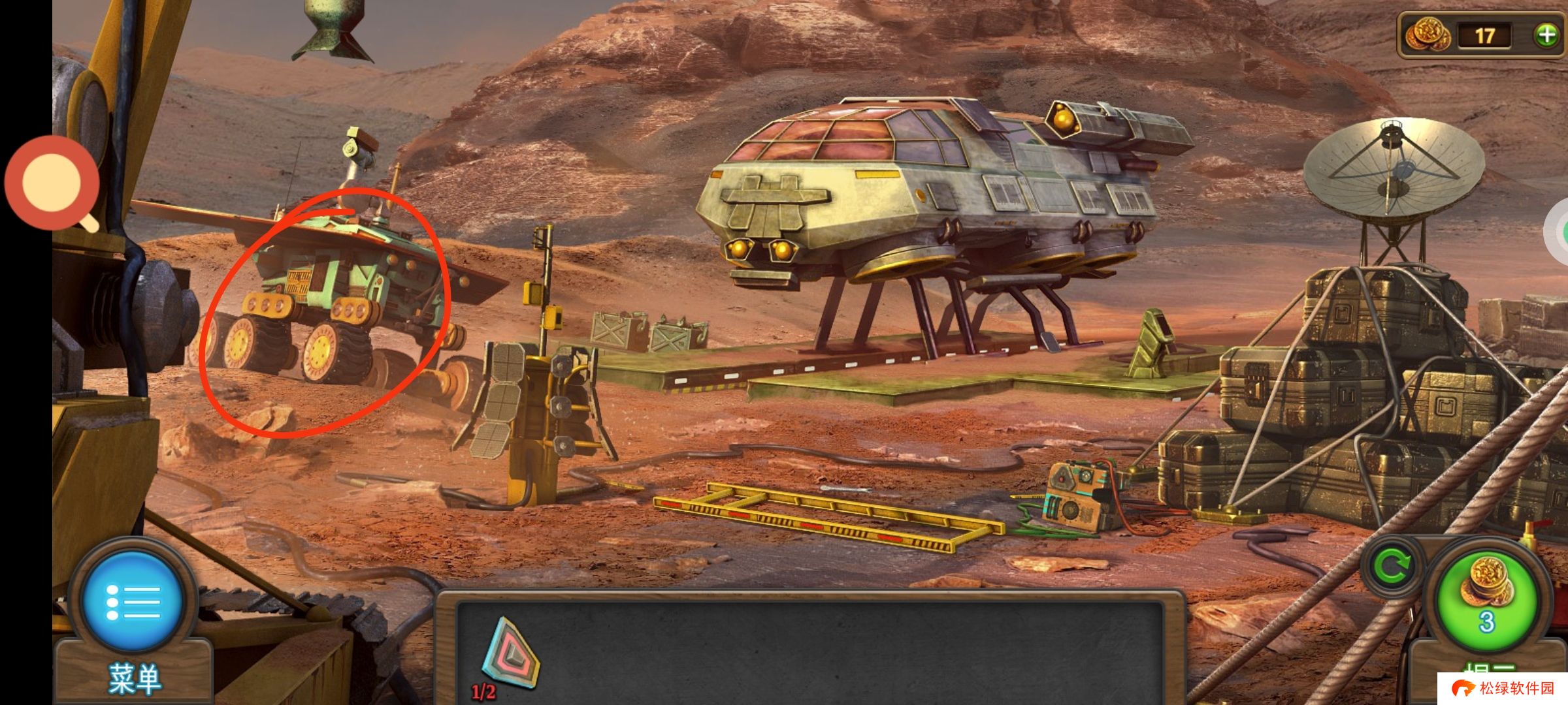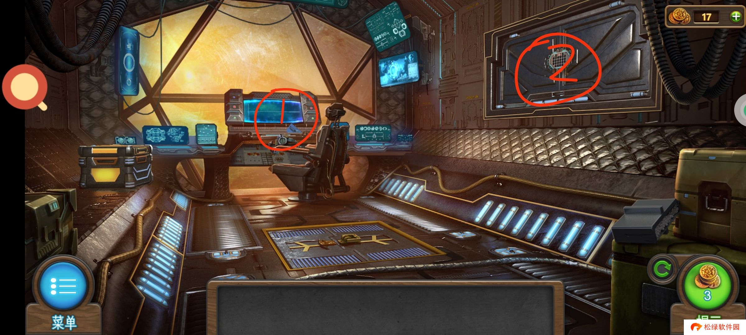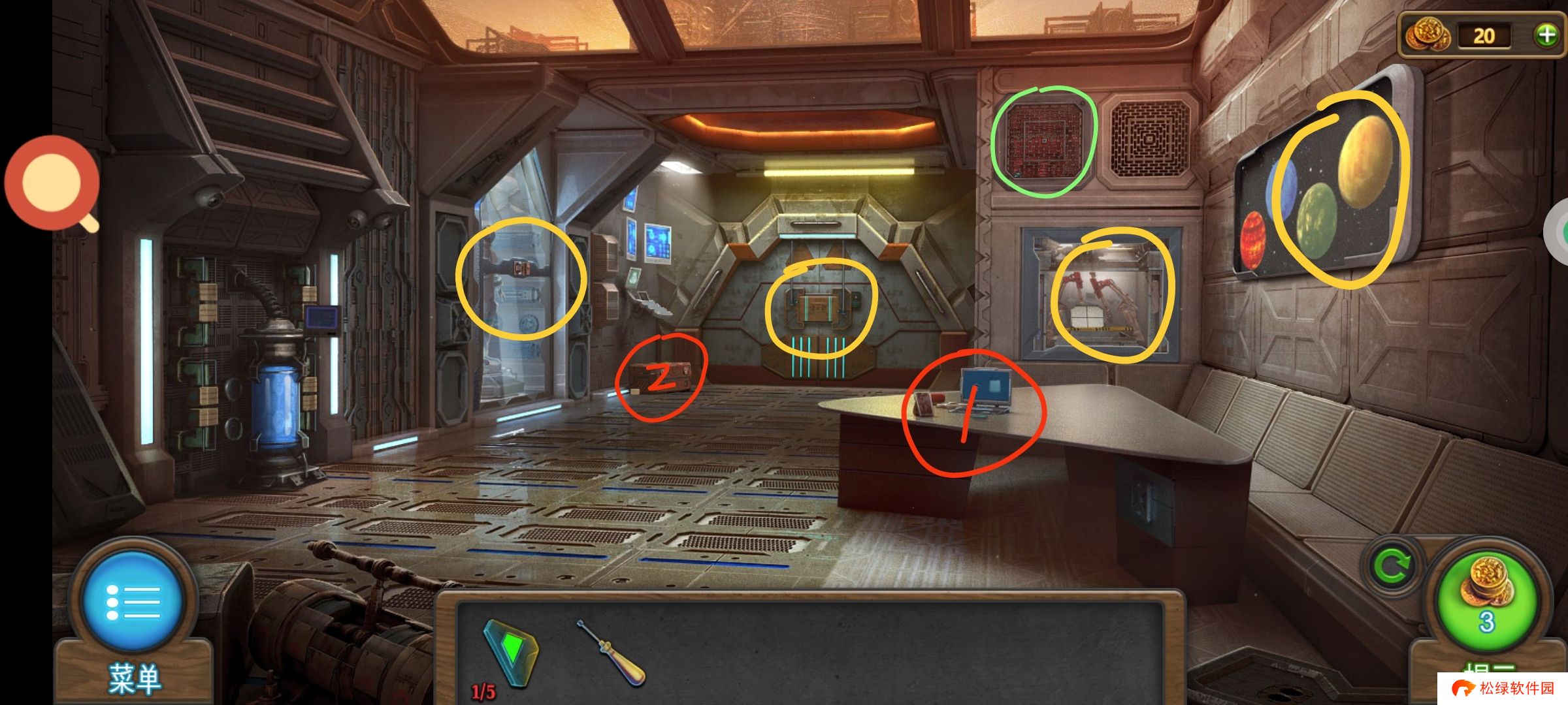 红圈处使用绿零件,完成小游戏。穿上太空服进入场景3。