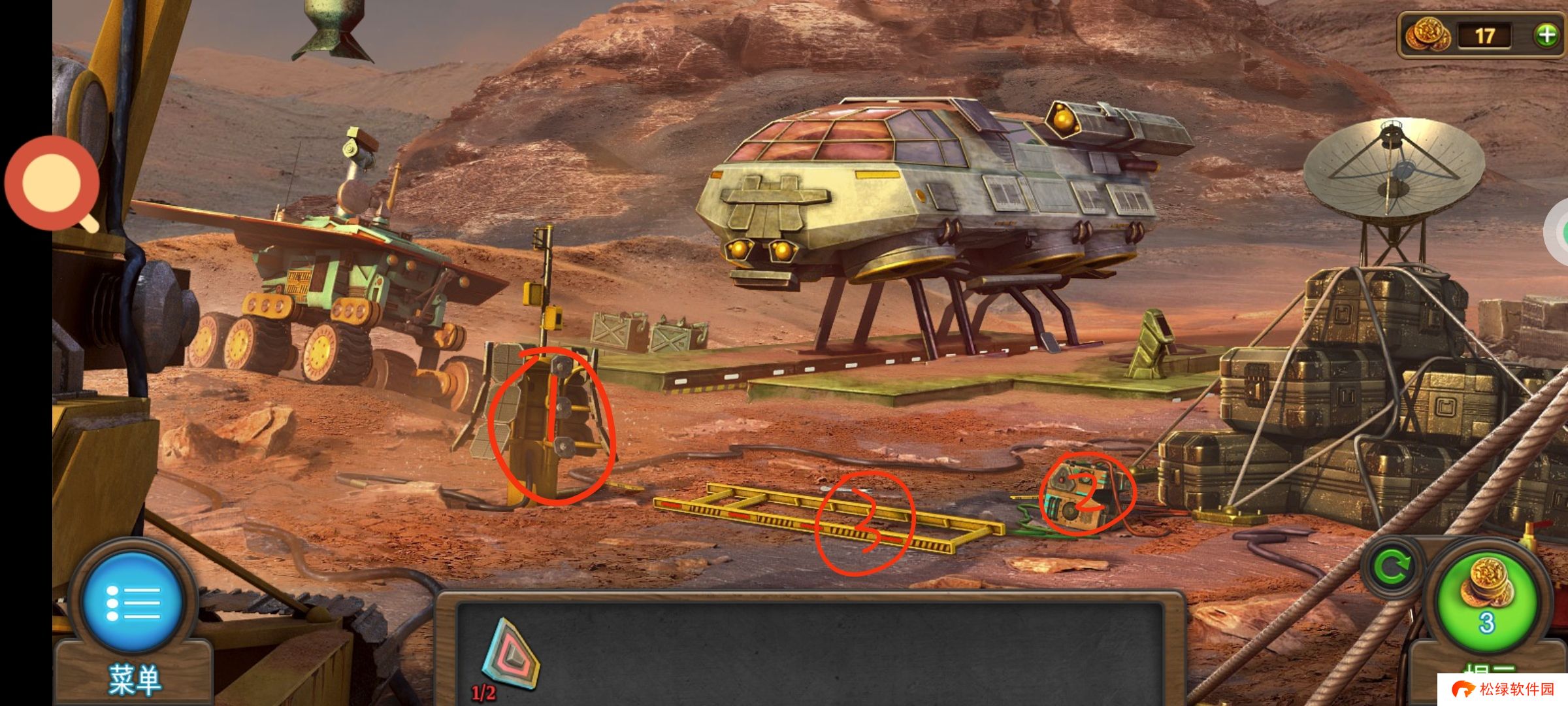 ❶红圈1处使用红零件,完成小游戏获得:①踏板3,②太阳能电池板2,③焊枪。
