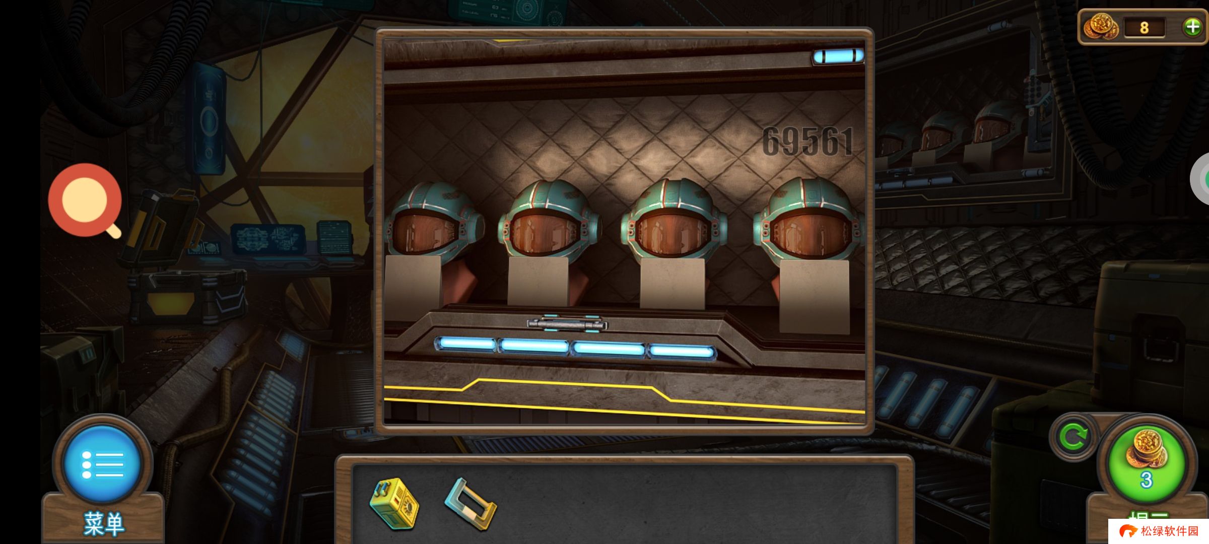 进入飞机,❶红圈1处用扫描器扫描,得到:带数据的扫描器。❷红圈2处用零件,完成小游戏,得到:把手。右上角数字69561记一下。