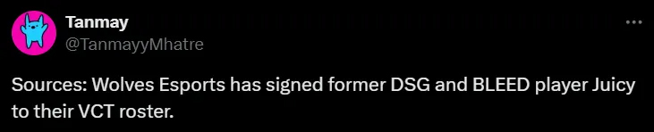 外网博主Tanmay爆料:前BLEED战队Juicy选手将加入VCT CN赛区狼队取代v1ya。