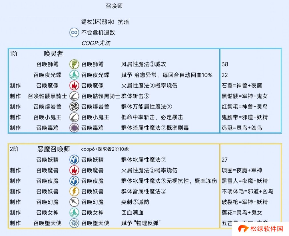 等级1 召唤士的原型 队伍可研习“唤灵者”。 等级2 异教的教义 降低队伍全员被施加异常状态“不安”的概率。 召唤士的风范 可以减少研习“召唤士”系统阿基态所需的MAG。 等级3 战斗的共鸣 尤法处于待机状态时,战斗结束后获得的经验值增加。 继承的艺术 “召唤士”系统的技能继承格增加至2格。 等级4 召唤士的品格 可以大幅减少研习“召唤士”系统阿基态所需的MAG。 等级5 继承的真谛 “召唤士”系统的技能继承格增加至3格。 等级6 召唤士的原型·最高阶 队伍可研习“恶魔召唤师”。 等级7 一心同体 即使尤法处于待机状态,战斗结束后也能获得全部经验值。 等级8 异教的秘密仪式 进一步降低队伍全员被施加异常状态“不安”的概率。 继承的精髓 “召唤士”系统的技能继承格增加至4格。 宏大的幻想 尤法具备获得前所未见的“极致英雄形象”的觉悟。