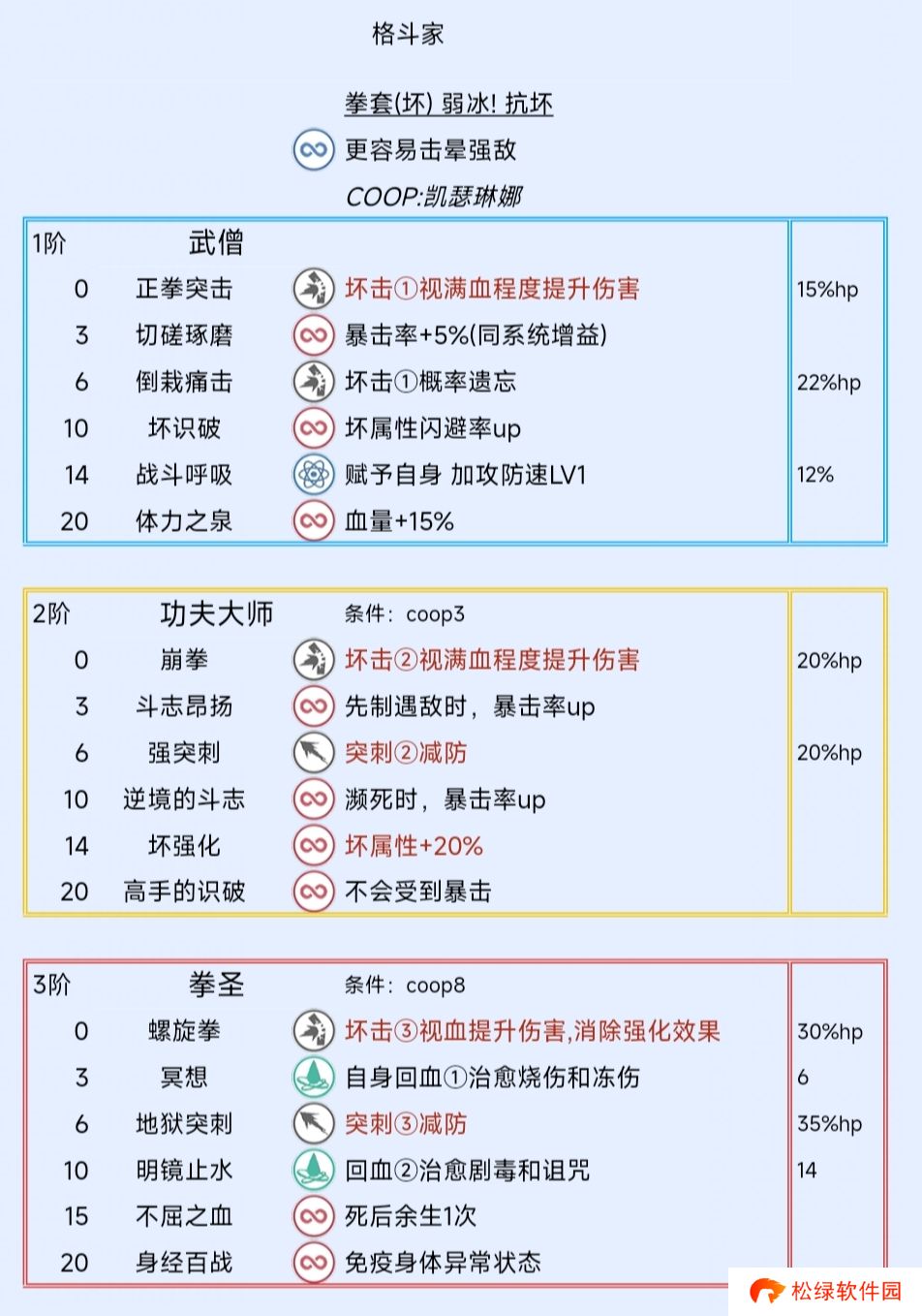 等级1 格斗家的原型 队伍可研习“武僧”。 等级2 格斗家的风范 可以减少研习“格斗家”系统阿基态所需的MAG。 等级3 格斗家的原型·高阶 队伍可研习“功夫大师”。 赏金追加 完成各个城镇征兵所的讨伐委托时,获得的赏金将会增加。 等级4 继承的艺术 “格斗家”系统的技能继承格增加至2格。 等级5 赏金猎人的嗅觉 可以获知迷宫内未探索区域的发光采集点的位置。 格斗家的品格 可以大幅减少研习“格斗家”系统阿基态所需的MAG。 等级6 继承的真谛 “格斗家”系统的技能继承格增加至3格。 等级7 并肩作战的决心 凯瑟琳娜会在特定迷宫中前来支援,在战斗中施放强力攻击。 打点行装的交涉 在各个城镇“杂货铺”购物时将获得折扣。 寻宝 可以获知未探索区域的宝箱位置。 等级8 继承的精髓 “格斗家”系统的技能继承格增加至4格。 格斗家的原型·最高阶 队伍可研习“拳圣”。