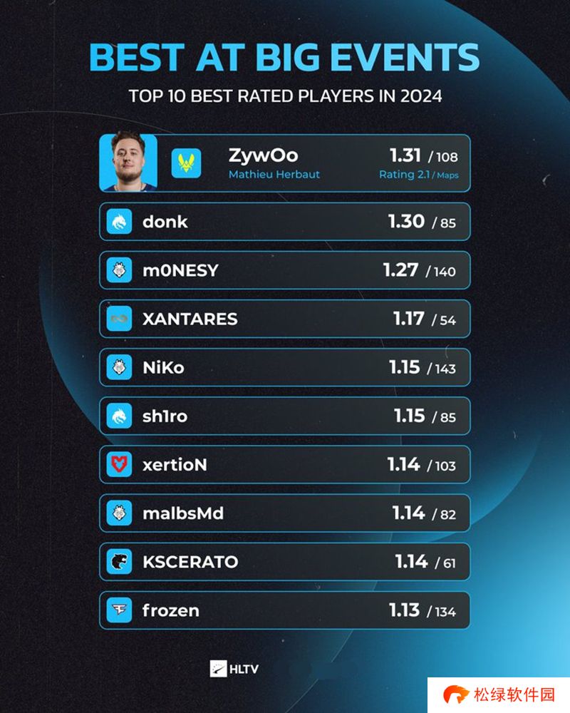 根据最新数据显示,ZywOo依旧是今年大赛数据最好的选手。他在108张地图上有着1.31的rating;第二名donk在85张地图上有着1.30的rating;第三名m0NESY在140张地图上有着1.27的rating。可以说今年Top1之争依旧充满变数。
