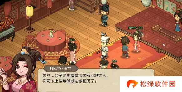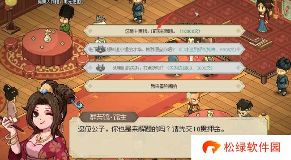 1、先去【群芳馆】触发谜题任务,然后和馆主对话给她10贯钱开始解谜;