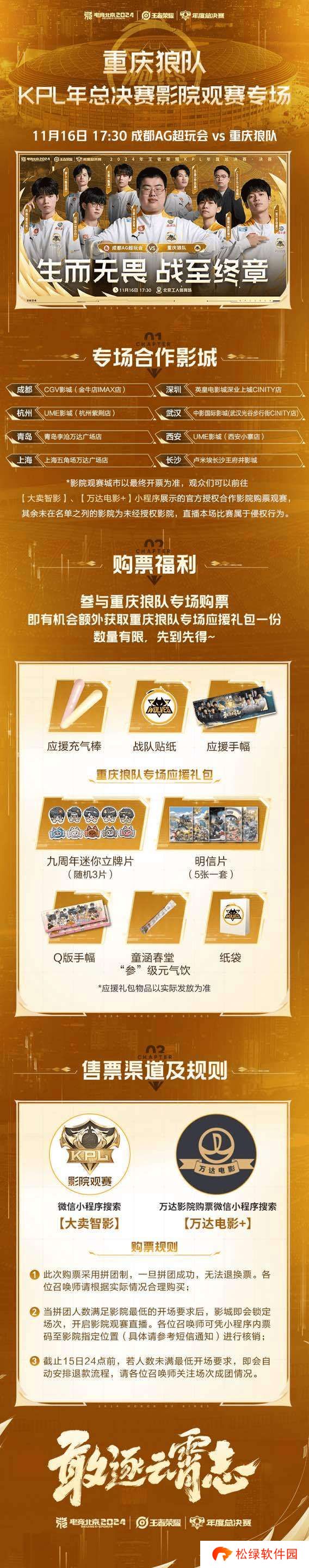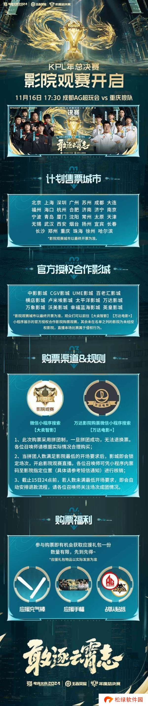 计划在全国34座城市开设KPL年总决赛影院观赛直播,购票观众可以领取一份应援礼包,数量有限先到先得;