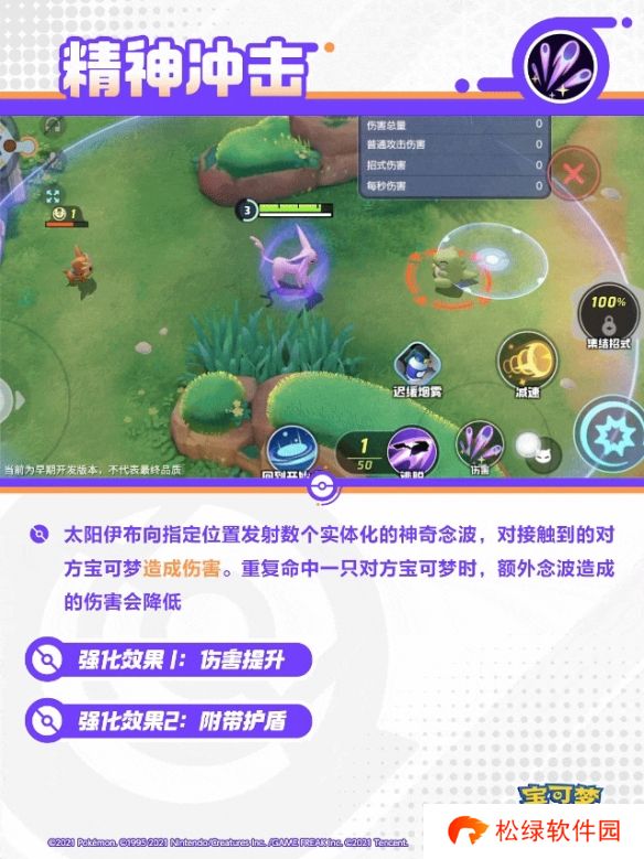 太阳伊布向指定对方宝可梦发射一团念力,造成2秒的减速效果。2秒后被念力附着的对方宝可梦以及它附近的其它宝可梦会受到伤害,和基于主目标已损体力一定比例的附加伤害。