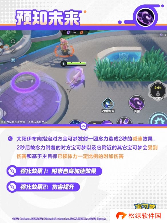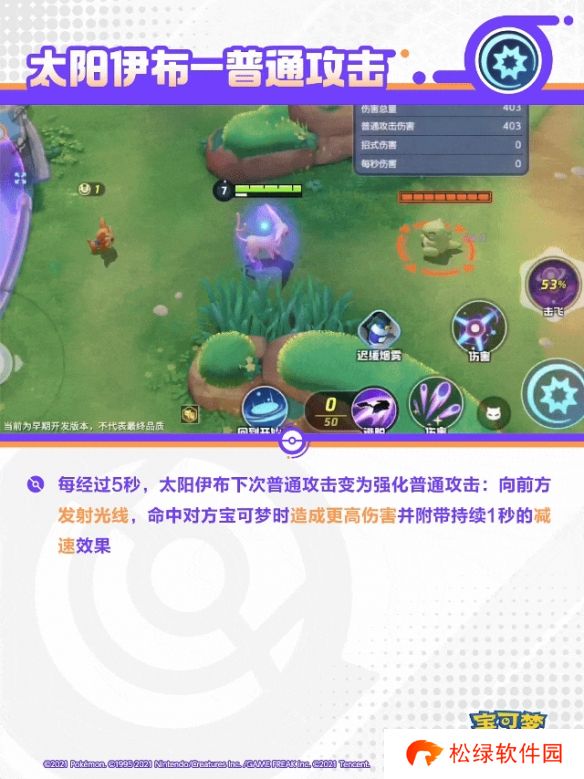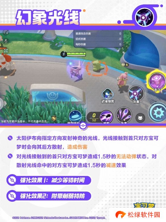 每经过5秒,太阳伊布下次普通攻击变为强化普通攻击:向前方发射光线,命中对方宝可梦时造成更高伤害并附带持续1秒的减速效果。